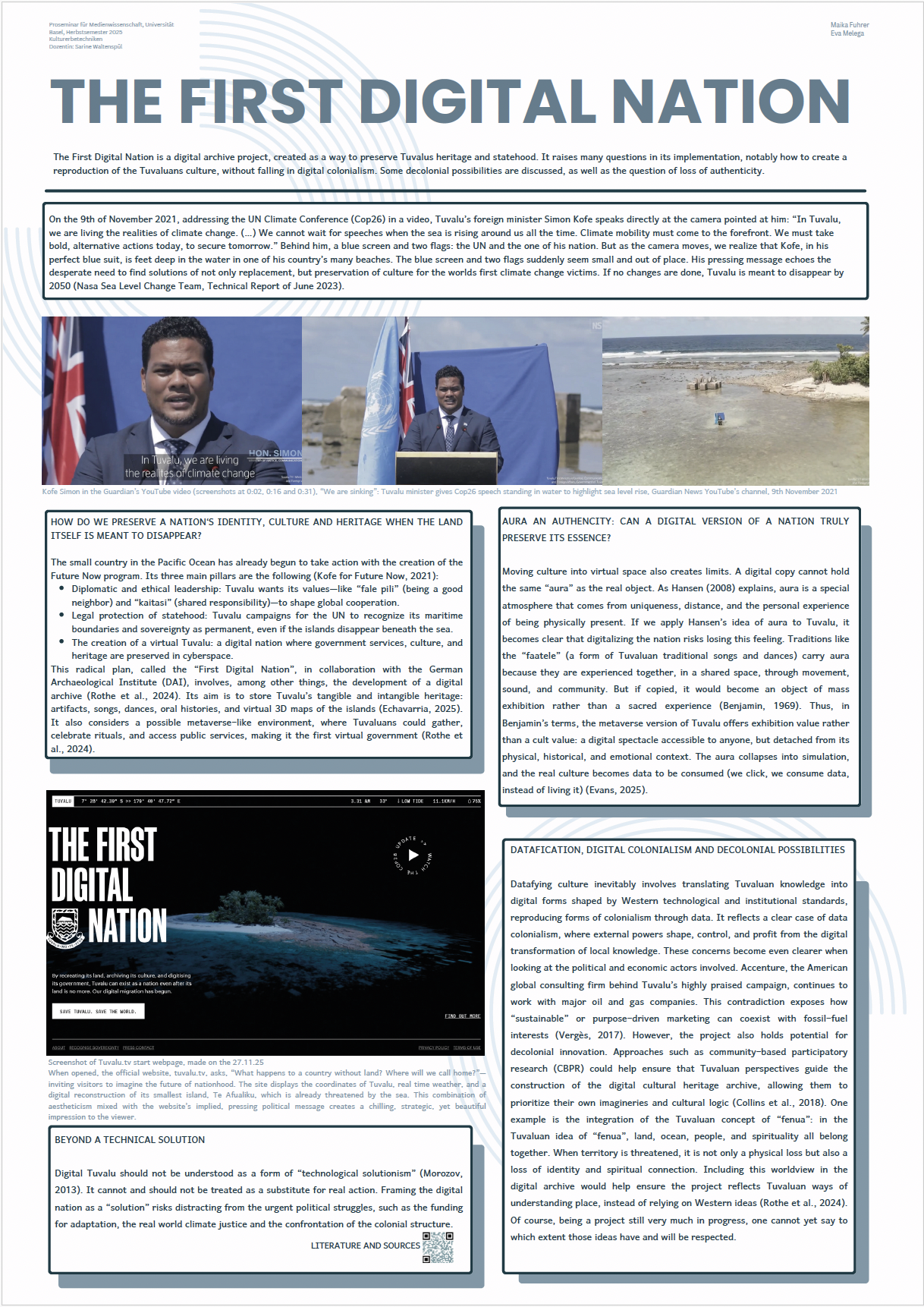 The First Digital Nation is a digital archive project, created as a way to preserve Tuvalus heritage and statehood. It raises many questions in its implementation, notably how to create a reproduction of the Tuvaluans culture, without falling in digital colonialism. Some decolonial possibilities are discussed, as well as the question of loss of authenticity.